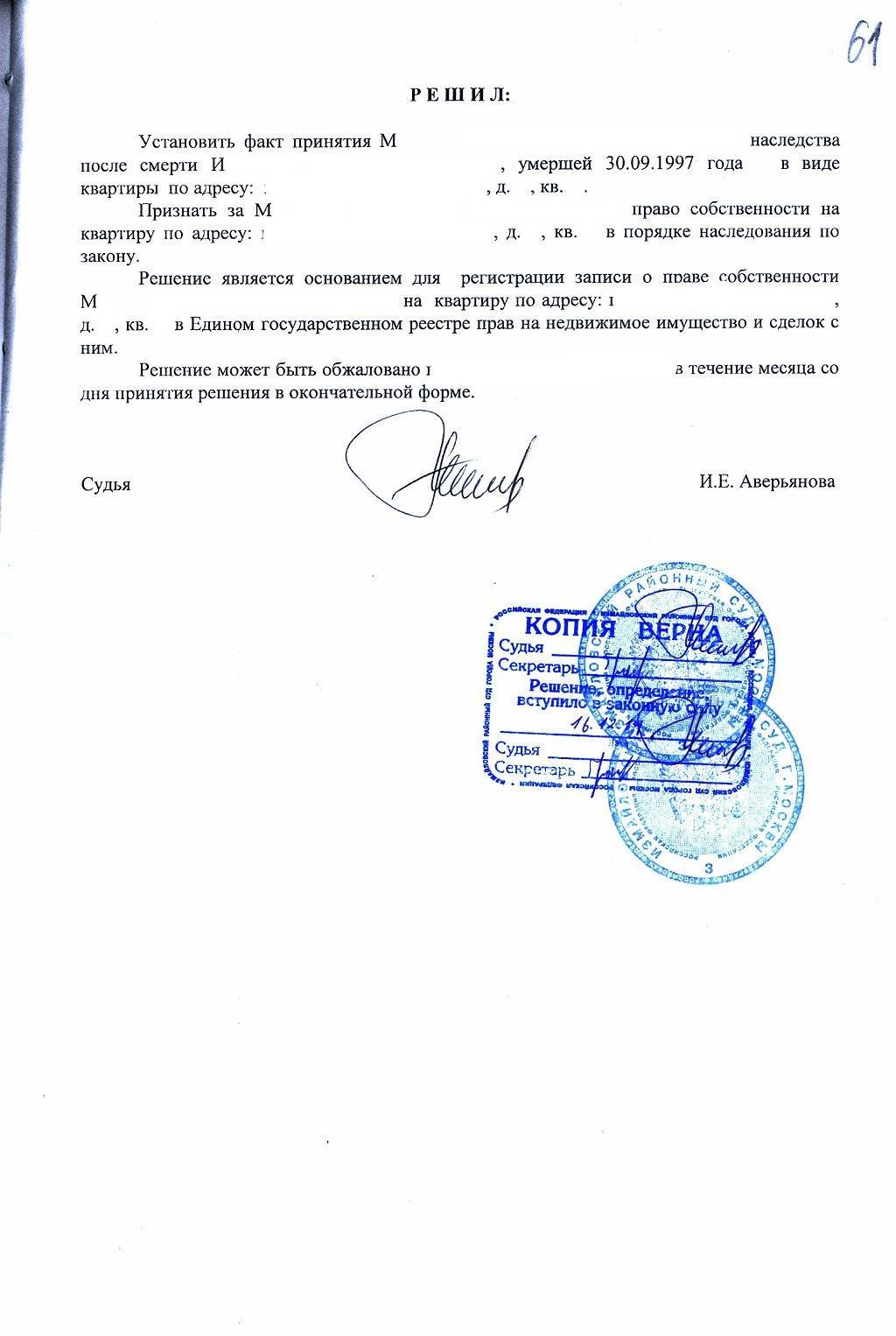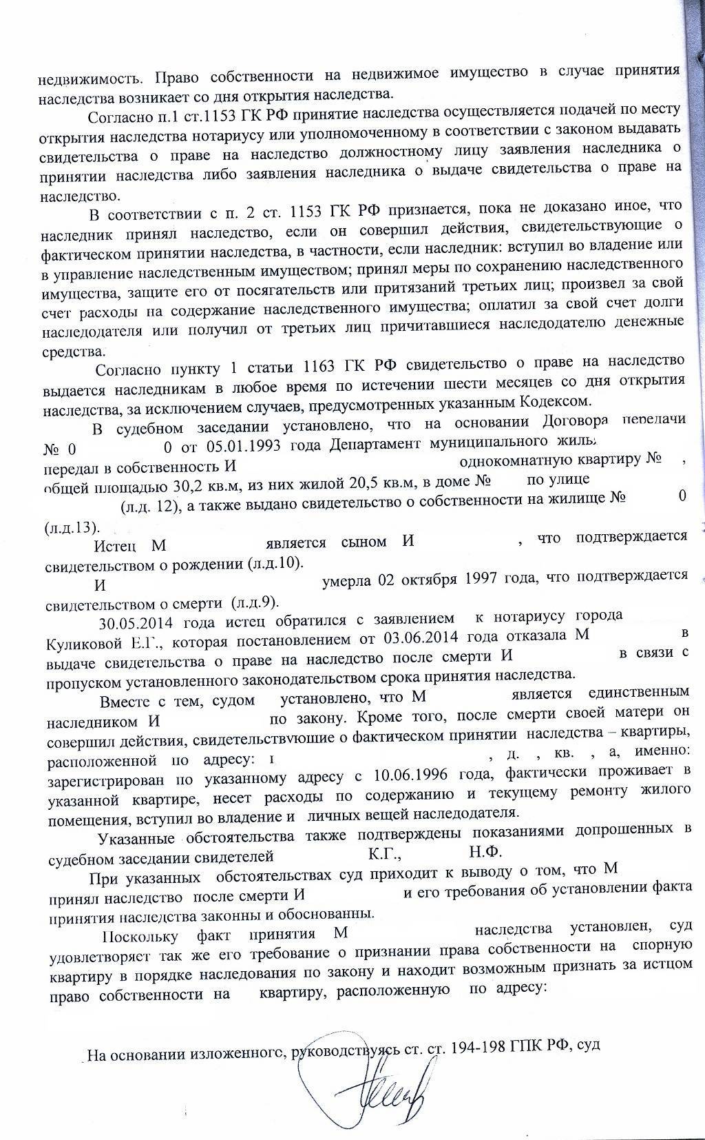 Требования истца были подтверждены договором передачи недвижимости его матери в 1993 году. Мать истца умерла в 1997 году. С момента открытия наследства истец совершал действия, подтверждающие факт принятия наследства по закону, а именно: